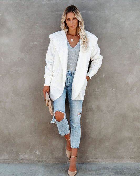En PromotionVeste Zippée en Fausse Fourrure Blanche à Capuche